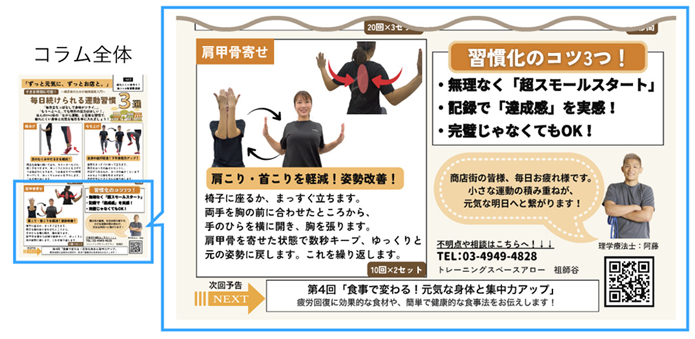 商店街で働く方々の健康維持と店舗の継続的な活力を支援する目的で、商店街掲示板等にて 「健康経営」をテーマにした月1回のコラム連載(全12回)を企画。年齢を重ねても元気にお店を続けていただくための“健康づくり”を応援したい、経営者自身の健康が、お店の活気やお客様満足につながるという視点を広めたい 、地域の商店街全体として「健康を大切にする雰囲気」を醸成したい 、このような想いのもと、商店主の皆さまに親しんでいただける内容を心がけて発信しています。